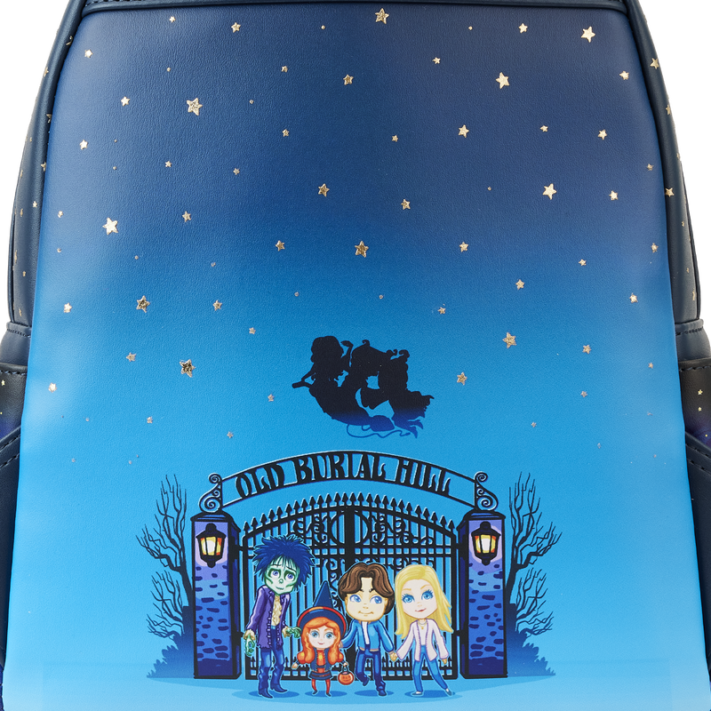 Sweep everyone off their feet with our bewitching Loungefly Disney Hocus Pocus Poster Mini Backpack. The classic movie poster, from the original film, comes to life with unique, in-house drawn art. Atop a gold-foil star-studded sky, the Sanderson Sisters fly. Applique and debossed details reveal Winifred, Sarah, Mary—and a vacuum cleaner broom—soaring over the moon. The moon is actually a figural pocket, where you can secure smaller items for all your journeys. Billy Butcherson, Max Dennison, Dani Dennison, and Allison gather below at the gates of Old Burial Hill. Binx also makes an appearance, flying over the Sanderson Sisters. Haunting details continue on the side pockets, too, where you’ll find the Sanderson Sisters gathered around a cauldron and Billy Butcherson climbing out of his grave. On the back, Max, Dani, Allison, and Billy make an encore appearance before the Old Burial Hill gates, and the shadows of the Sanderson Sisters fly overhead. In the dark, the edges of the moon on the front glow, along with the edges of the vacuum cleaner and outlines for the Sanderson Sisters. On the side pockets, outlines from the cauldron, flames, and the three Sisters glow; Billy Butcherson’s outline glows, as well as the skull and crossbones on the tombstone behind him. Make a spellbinding entrance wherever you go with this frightfully fun accessory.