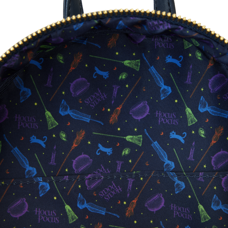 The Loungefly Disney Hocus Pocus Poster Mini Backpack is made of vegan leather (polyurethane). Bag has adjustable shoulder straps and gold-colored hardware. Additional features include applique, glow-in-the-dark, debossed, gold foil, and printed details. Take note of the coordinating inside lining.