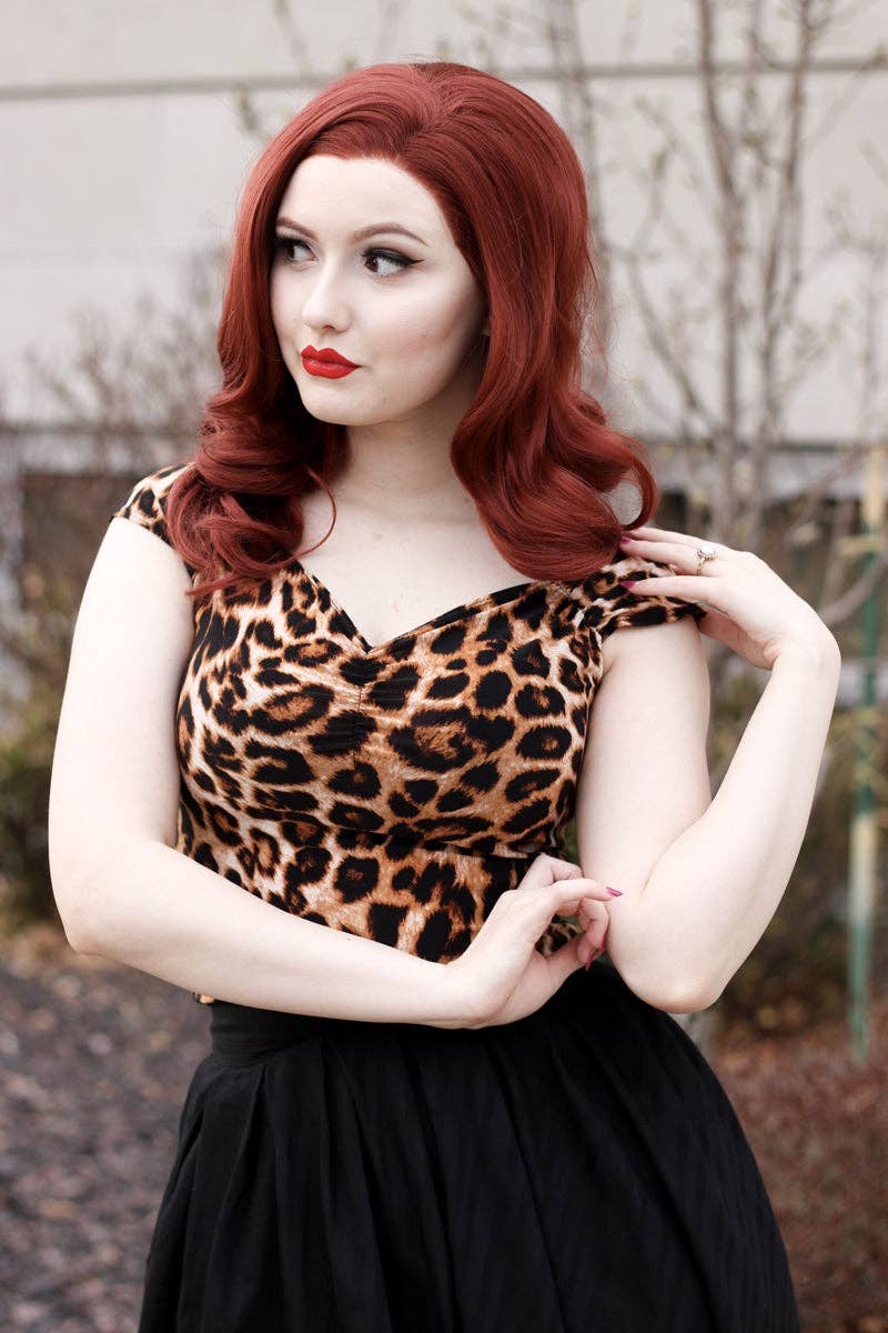 Looking for a pinup-approved top? Well look no further: the Isabel top is a vintage staple with modern features! Shown in our va va voom leopard, this super soft and stretchy top features a figure-flattering sweetheart neckline, shirring at the bust and on the sleeves, and is a pullover style with no zippers or buttons. Pair with a swing skirt for the ultimate retro ensemble or your favorite jeans. The options are endless!
