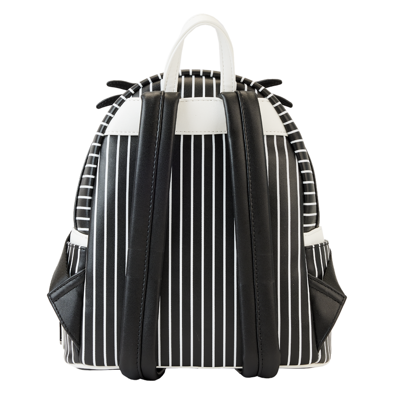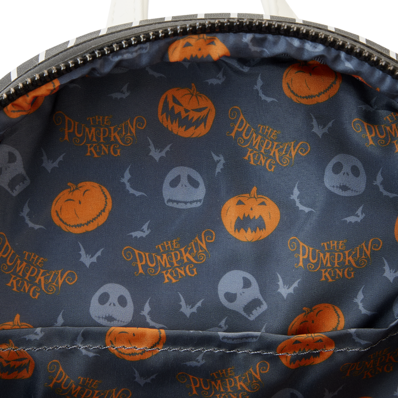 The Loungefly Nightmare Before Christmas Jack Pumpkin Head Mini Backpack is made of vegan leather (polyurethane). Bag has adjustable shoulder straps and sturdy metal hardware. Additional features include applique, debossed, quilted, and printed details. Take note of the coordinating inside lining.